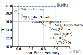 结果显示,用预训练模型训练的GAN具有更高的线性探测精度,一般来说,可以实现更好的FID指标。