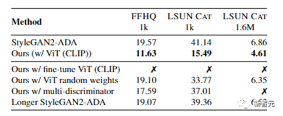 总的来说,在只有1万个训练样本的情况下,该方法在LSUN CAT上的FID与在160万张图像上训练的StyleGAN2性能差不多。
