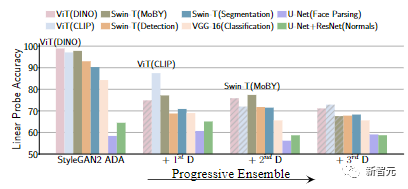 当我们逐步增加下一个判别器时,可以看到线性探测对预训练模型的特征的准确性在逐渐下降,也就是说生成器更强了。