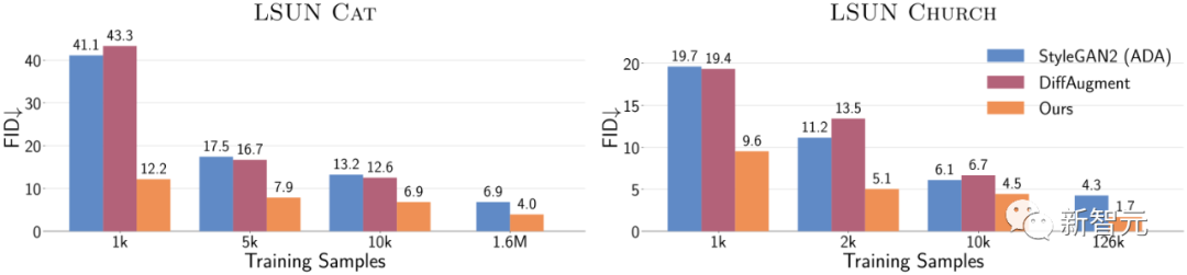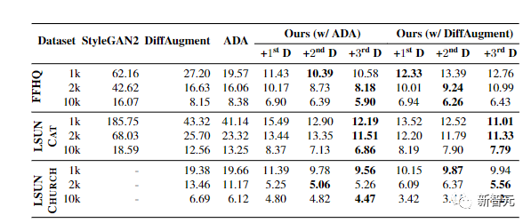 最终实验展示了在FFHQ、LSUN CAT和LSUN CHURCH数据集的训练样本从1k到10k变化时的结果。