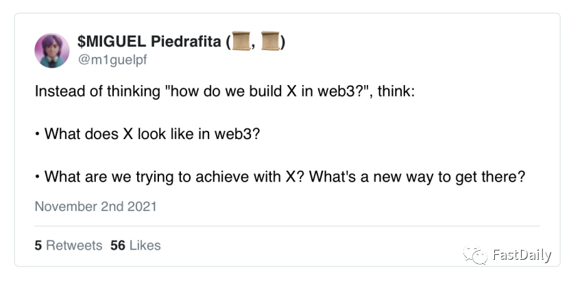 在我职业生涯的每一个阶段,我都被建议要去一家知名公司工作,在那里我可以“建立自己的品牌并打开大门”。这是很好的建议,但这是你给你的子女提供的那种确保他们会成功的建议,即使你本人选择了一条更冒险的路线,并且喜欢它。我没有走这条路,而是为一些相对不知名的初创公司工作,专注于我关心的重大和困难的问题。我绝对不是在抱怨,但为了让更多的人走上创业道路,我们必须让声誉体系少一些偏见,比起输赢更多地基于工作质量。我要提出的论点是,正在开发的互联网(或web3)的下一个迭代将通过更频繁、更细化的背书,将声誉从从属关系中分离出来。这也是对“LinkedIn的下一次迭代是什么”问题的回答,只不过答案不是迭代,而是完全取代现有系统。正如Miguel Piedrafita所说的那样,我们需要一种第一原则的方法。换句话说,我们必须抵制这种认为区块链上的一切都更好的拟物化诱惑。有些东西放在区块链上就和以前一样。