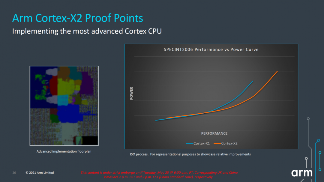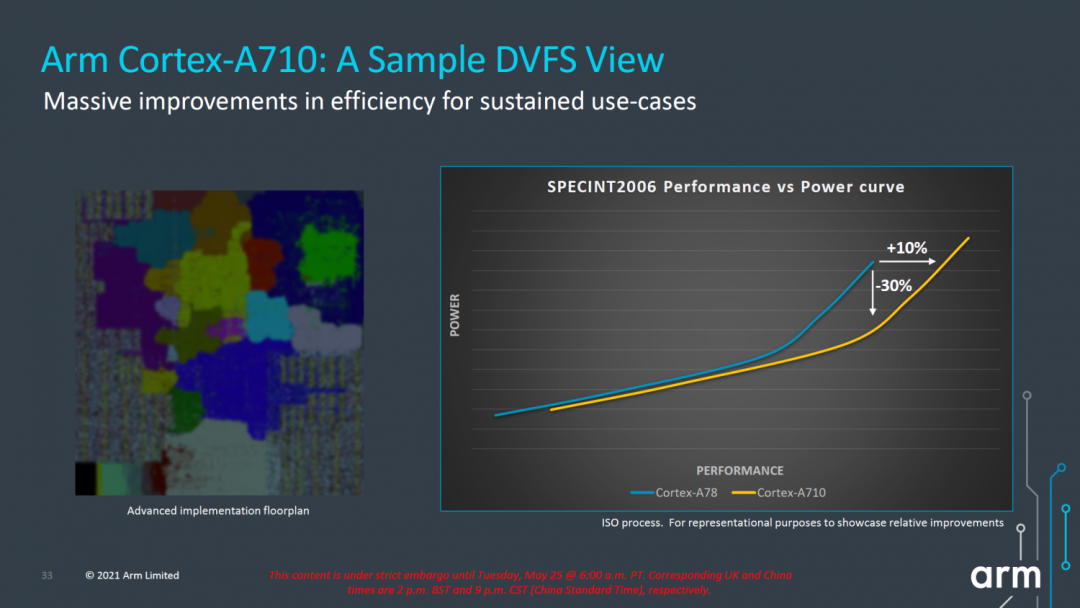 即使不算是消费电子发烧友 ,近两年应该也知晓「火龙」这个梗。主要原因还是在近几代 Android 旗舰芯片接连在功耗上「翻车」,高性能往往伴随着高能耗,随之也伴随着手机热量陡升。如此带来了一个好处和一个坏处。好处是,厂商们「散热」水平越来越高,坏处是,芯片调校上也越发保守,以及更低的温控墙。在持续高性能的压榨下(比如跑个《原神》),基本上在 10~15 分钟,产品们都会主动降低芯片超大核的频率,倘若温度依然高升,接下来限制发挥的就是大核心。反过来说,用上更先进工艺的旗舰芯片,在日常状况下,应该有续航上的提升才对。但在使用中,续航的提升却是「洒洒水」,成效不大,全靠高功率快充来续命。另外,还有一点,近来三星代工厂 4nm 工艺不稳定,也算是一个原因。自家的 Exynos 2200 旗舰芯片也出现了表现不佳的状况,并非有意为之。于是,「深受其害」的高通,在刚刚公布的骁龙 8+ Gen1 Soc 上,也高调地宣布用上了台积电 4nm 工艺,并在 PPT 里直接写明性能提升 10%,功耗降低 30%。似乎,Android 旗舰芯片表现的差,都因为三星 4nm 工艺「太菜」了,所以台积电就是「救兵」么?台积电与三星,几乎是世界上先进制程芯片生产的两大寡头。二者几乎霸占了世界上 10nm 以下芯片生产的市场。几年之间,从 10nm 一直竞争到 4nm,并且它们也在疯狂氪金建造 3nm 产线和代工厂,竞争正在愈演愈烈。与台积电纯代工厂不同,三星是一家集自主设计芯片、生产芯片以及 Exynos 自有芯片的垂直整合制造(IDM)企业。10 年前,三星是要领先于台积电,苹果的 A4 芯片也是魔改自三星 Exynos,并由其代工。由于三星特殊的身份,加上屏幕和内存都要依赖三星,风险过高,苹果便开始扶持台积电,进而转移风险。历经曲折,台积电新建产线,调拨专业团队,最终拿下了苹果 A8 芯片的独家代工,加上 iPhone 6、6 Plus 的空前热销,促使台积电从中获益颇丰。后续,苹果的 A 系芯片开始与台积电绑定,并通过资源倾斜帮助其发展。如今,苹果的 A 系、M 系芯片全部由台积电代工,并成为优先级最高的客户,没有之一。台积电与苹果深度绑定. 图片来自:appuals.com5nm、4nm均落后于台积电的三星,并没有气馁,而是梭哈了一把。对外宣称了一笔133万亿韩元(约8000万亿元)的投资,剑指3nm制程,并借此成为世界最大的SoC制造商。并且,放弃 FinFEET 技术,而是一步到位到 GAAFET 晶体管技术,从而实现对台积电的反超,成败在此一举。回到当下,三星的 5nm、4nm 晶圆密度和工艺的稳定性都不如台积电,因而反馈到旗舰芯片上来说,确实会有一定的差距。今年年初的联发科天玑 9000 便采用的是台积电 4nm 工艺,1+3+4 的三丛架构中的 Cortex-X2 超大核(3.05GHz)、A710 大核心(2.85GHz)、A510 中核心(1.8GHz)的频率均远超高通骁龙 8 Gen1。理论上,它有着更高的性能,和更好的能效比,就是一枚完美的旗舰芯片。只不过,苦等几个月,当搭载天玑 9000 的旗舰们上市后,真实的能效表现其实与高通版相差不大,倘若不去仔细对比的话,可能根本察觉不出。此次高通高调的宣传,采用台积电 4nm 工艺骁龙 8+ Gen1 会有着更佳的表现时,我其实并没有报以多高的期待。骁龙 8+ Gen1 发布后,许多厂商的「超大杯」也要回归了,重头戏来了.鉴于骁龙 8+ Gen1 全面的超频(Cortex-X2 3.2GHz + A710 2.75GHz + A510 2.0GHz),绝对性能会有所提升,至于提升多少还得看厂商们的调校,能效也是如此。如此,台积电的 4nm 制程工艺,对旗舰芯片的表现更像是一块「遮羞布」,盖住的其实是 Arm 极其孱弱的公版新架构。十年之间,Arm 共更迭了 9 版架构,最新的 Armv9 相对来说是一次重要的指令集升级。随着指令集的升级,Arm 也对外公布了公版的 CPU IP,也就是我们在骁龙 8 Gen1 和天玑 9000 上看到的超大核心 Cortex-X2、大核心(性能核心)Cortex-A710 和中核心(效能核心)Cortex-A510。公版的 CPU 架构依然采用三丛架构,即 1+3+4。它算是此前 big.LITTLE 架构的进化版。目的无非就是「合适的核心做合适的工作」,以此来提升能效。大小核混用的架构,现在也被广泛的运用在 X86 和 Arm 架构的桌面级和移动端 CPU 之中。Arm 公版的三丛架构,如果各司其职的话,超大核 X2 提供的是绝对性能,大核心 A710 分担的是日常的性能需求,而中核心 A510 则以低功耗完成相应任务。Cortex-X2,它就是 X1 的全面优化版,L3 的缓存翻倍至 8MB,缓存区增大,优化通信延迟,进而获得了 16% 的 IPC 提升(也可以理解性能)。从后续的产品中,骁龙 8Gen1 和天玑 9000 在性能全开的情况下,的确相比骁龙 888 有着更好的表现,同时功耗也没有「爆炸」。但大核心和中核心,就有很大的问题,而导致旗舰芯片频繁翻车的也是这两个有着全新「名称」的核心。Cortex-A710,并没有采用更新的架构,依然是经典 A78 的优化,称之为 A79 可能更为准确。Anandtech 对这个新名号直呼为「an interesting marketing tidbit(好一个营销手段)」,A710 的表现也就不言而喻了。Arm 的 PPT 上,A710 有了 10% 的性能提升,同时也优化了 30% 的能效。不过,从曲线上来看,高出的性能,多位于高能耗部分,且是通过 L3 缓存翻倍(8MB)获得。能效的优化,不过是缩减了 A710 核心的分发吞吐量(由 6 缩减为 5),而并非是架构的优化而来。A710 是 A78 的优化版,而 A78 则是 A77 的超频版。Arm 大核心的设计团队几年之间,依然在挖掘 A77 架构的潜力,只是 A78 达到架构甜点频率之后,A710 的能效比就暴雷了,尤其是当系统需要高性能但不足以