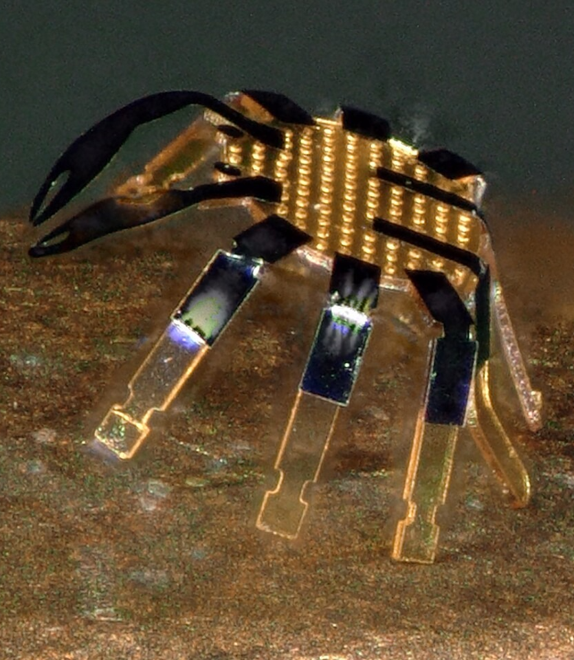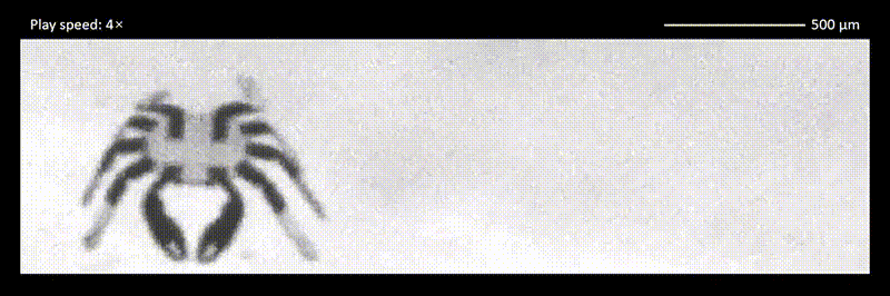 在刘慈欣的短篇科幻小说《白垩纪往事》里,体型庞大的恐龙做不了精细的工作,但蚂蚁可以,于是二者各取所长,合力发展了属于自己的文明。蚂蚁体型小巧难以被发现的特性,也对推动故事发展起了重要作用。恐龙或许很难发现身上的蚂蚁,但若是爬到人的身上,还是有可能会被发现的,动画版西游记有一个经典的场景就是唐僧放生了一只爬到自己身上的蚂蚁。不过,如果出现在身上的是这个微型机器人,可就不一定能发现了,毕竟它的宽度只有半毫米。图片来自:Northwestern University西北大学研究开发的这款螃蟹状的微型机器人,甚至比很难发现的跳蚤还要小,尺寸达到亚毫米级的它既小又轻,也就更难被发现。不过移动速度也并不算快,每秒大约能以身长一半的速度移动。图片来自:Northwestern University这种微型机器人的想法和概念其实在许多科幻小说或电影里都出现过(比如在海报里总是站在超级英雄身上的那个男人——蚁人),也曾有研究人员制造过用于探索目的或将药物运送到特定的解剖结构的类似物体,不过这些大都是依靠类似漂流的方式在体内移动。与这些机器人不同,西北大学开发的这个「亚毫米级小螃蟹」,可以弯曲、扭曲、爬行、行走、转身,甚至连跳跃也不在话下,更重要的是,这些动作都可以在没有电线或物理连接的情况下通过远程操纵完成。图片来自:Northwestern University没有复杂的硬件、液压或电力驱动但也能移动,是因为这个亚毫米级机器人的制作材料——形状记忆合金。它的力量就来自身体的弹性,由于加热时这种材料会变为「记忆」下的形状,所以只要对它进行加热,就能控制它的移动。图片来自:Northwestern University这款机器人的运动和操纵模式中,可以用全局加热进行弯曲、扭曲和膨胀,也可以用激光诱导进行局部热驱动来实现线性/曲线爬行、行走、转弯和跳跃。激光不仅能远程控制机器人启动,激光扫描方向也决定了机器人的行走方向。图片来自:Northwestern University既然体态特殊,那这种体积小巧又「听话」的机器人,自然有自己特殊的用处。虽然这项研究目前还处于探索性阶段,但研究人员认为,依靠这种技术,它或许可以成为能够在狭窄空间内执行实际任务的微型机器人。图片来自:Northwestern University比如,这些「小螃蟹」可以修复或组装工业中小型结构或机器;也可以作为微创手术的「手术助理」,去疏通阻塞的动脉、止血或切除癌性肿瘤……参与这项研究的教授 John A. Rogers 还表示,有了这些装配技术和材料概念,可以建造多种尺寸或三维形状的行走机器人。有趣的是,也有人对这种微型机器人产生了有些「奇特」的疑惑:如果它爬进耳朵里怎么办?![]()