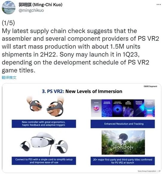 近日,天风国际分析师郭明錤发布推文称,PSVR2的量产将于2022年下半年开始并出货150万台。基于此,郭明錤推测索尼将准备在2023年第一季度推出PSVR2,具体取决于PSVR 2游戏的开发进度。