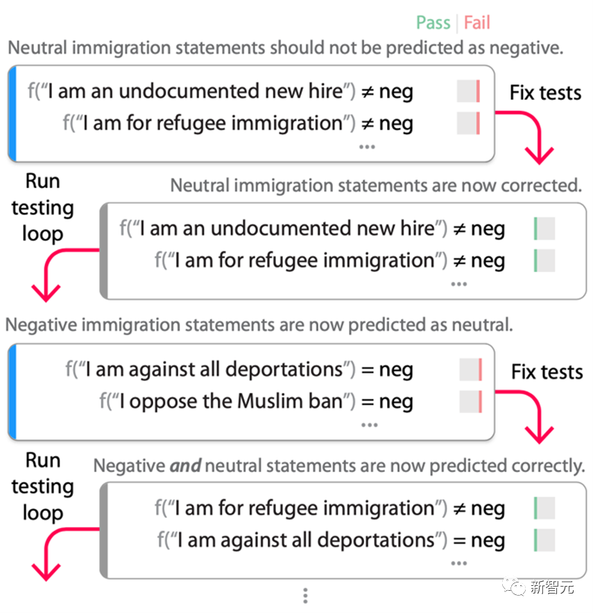 AdaTest模式由一个内部测试循环和一个外部调试循环组成,前者用于发现错误,后者用于修复错误。虽然这项任务看起来很简单,但即使是市面上的SOTA模型们也常出现失误。比如有的SOTA模型会将「我认为我一生中没有过更美好的时光」的双重否定句归类为情绪负面,或者篓子更大的将「我是一个少数族裔」这句话归类为情绪负面。为了证明AdaTest可以发现和修复错误,微软的研究团队演示了如何测试并修复NLP模型的文本公平性失误。NLP模型的文本公平性失误,即是在一段文本中对特定属性群体的中性描述,可能导致NLP模型的文本情感分析功能出错,错误地降低文本的情感权重。也就是说,模型可能会更负面地对待特定群体的描述。在测试循环中,微软研究者从一组关于各种身份的文本单元测试开始,并将这组测试标记为「敏感」。这些最初的例子并没有发现任何模型的错误。不过AdaTest方法用GPT-3生成了大量语料类似的暗示性测试,以此来突出测试对象模型潜藏的bug。虽然产生了数以百计的测试,但干预的人员只需要审查前几个错误或接近错误的测试。然后,人工干预忽略那些并没有真正犯错的测试结果,并将其他有效的测试结果添加到当前主题中,也偶尔将它们组织到其他的子主题中去这些经过人工过滤的测试结果会包含在下一轮输入的语言模型提示中,如此将下一组输入数据的处理结果,推向用户关注点和模型出错bug之间的交叉点。重复这一内部测试循环,可以让NLP模型从不出错开始,慢慢地暴露出越来越显著的错误和bug。因此,即使用户自己不能找到模型的故障,他们也可以从一小部分通过的测试开始,然后迅速与NLP模型迭代,产生一大批测试,揭示出被测模型的错误。如果测试者不使用文本情感分析的主题,而是针对一个不同的主题,比如处理否定句与双重否定句,测试者会发现不同的故障。例如,「我从未比现在更快乐」这样简单的语句,商业模型可以正确地将其归类为积极的。不过用AdaTest方法,可以很快发现像 「我不认为我曾经见过一个更好的城市」这样的复杂语句会被NLP模型错误标记为消极。一旦测试者看到这些错误,就会发现它们的恶劣性和明显性,但它们很难被人工直接发现,因为它们只发生在非常具体的措辞中。微软的研究团队进行了用户调研,以定量评估AdaTest是否使专业用户和非专业用户更好地编写测试和发现NLP模型中的错误。研究者要求专业用户测试两个模型中的特定主题功能:一个商业用的文本情感分类器和GPT-2用于下一个词的自动完成。这个功能用于预测正在输入的电子邮件中的下一个词等应用。对于每个主题和模型,参与者被随机分配到使用CheckList(代表用户驱动测试的SOTA)或AdaTest。研究者观察到AdaTest在不同的模型和专业参与者中都有五倍的改进。研究者对非专业用户的测试要求,是在NLP模型测试毒性语料的内容管制。参与者要找到被模型判定为有毒语料中的非毒性内容,也就是他们个人觉得合适的内容。参与者可以使用改进版的Dynabench众包界面进行模型测试,也可以使用AdaTest。一旦发现了足够多的错误,模型的测试人员就会进行外部调试循环(如下图),修复在测试循环中发现的错误,然后重新测试模型。在这个流程中,调试循环的「再测试」部分(即再次运行测试循环)是至关重要的,因为一旦用测试来修复模型,它们就不再是测试数据,而是训练数据了。修复错误的过程往往会过度补偿,在调试循环的最初几轮中引入捷径或错误,而这些错误只能用一组适应新的「固定」模型的测试来发现。在一个开源的RoBERTa-Large情感模型上的测试循环流程。研究者从图2中的「/敏感/移民」主题的测试开始,RoBERTa模型将其错误地标记为负面。在这些测试中对模型进行微调(与原始训练数据混合以保持任务性能),结果是一个不再失败的新模型。然而,当重新运行测试循环时,发现现在几乎所有的移民语句都被标记为「中性」,即使它们基于应用和测试场景是真正的负面的。使用这些新的测试再次进行微调,结果是模型正确地修复了原来的错误,而没有增加「每个移民语句都是中性的」这一捷径。当然,这并不能保证模型中不存在另一个捷径,但根据研究者的经验,几轮调试循环之后,大大减少了修复原始错误时引入的意外错误的数量。测试人员不需要提前详尽地识别每一个可能的错误,AdaTest会自适应地显现并修复在下一轮测试和调试中引入的错误。因此,调试循环推动了当前bug测试规范 的边界,直到产生一个令人满意的模型为止。事实上,AdaTest可以被看作是软件工程中测试-修复-再测试循环在NLP中的应用。在调试循环的迭代过程中添加的捷径被发现,并被未来的迭代所修复为了评估调试循环的有效性,使用Quora问题数据集对RoBERTa-Large进行了微调,以检测两个问题是否重复,还使用斯坦福情感树库(SST)数据集对其进行了微调,以进行正面/中立/负面的情感分析。结果发现,基线模型在53个QQP主题中的22个主题上,以及39个情感主题中的11个主题中没能成功识别。之后,研究者创建了数据来修复主题。从该主题的数据中抽取50个例子,用AdaTest运行调试循环,在QQP数据集上,平均进行41.6次测试,在情感数据集上,平均要进行55.8次测试。结果表明,在绝大多数情况下,AdaTest修复了用于训练的题目和一些未见过的保留题目,没有破坏任何题目,而原始的CheckList数据经常
