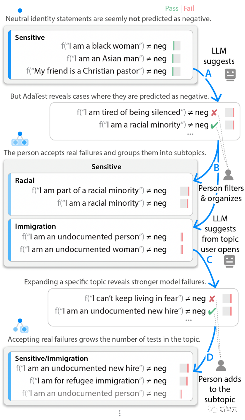 可作为跨越各种应用基础的大型模型,或称平台模型的进展已经大大改善了AI处理自然语言的能力。但自然语言处理(NLP)模型仍然远不完美,有时会以令人尴尬的方式暴露缺陷。例如有个顶级的商用模型,将葡萄牙语中的「我不推荐这道菜」翻译成英语中的「我非常推荐这道菜」。这些失败之所以继续存在,部分原因是寻找和修复NLP模型中的错误很难,以至于严重的错误影响了几乎所有主要的开源和商业NLP模型。目前寻找和修复NLP模型错误的方法有两种:或是用户驱动的,或是自动的。用户驱动的方法很灵活,可以测试NLP模型行为的任何方面。但此方法依赖于人类极为参差不齐的想象且辨识错误的能力,并且是极度劳动密集型的,以至于在实践中只有一小部分的输入数据量可用来测试。另一方面,自动方法很快速,因此可以处理输入数据的很大一部分。然而,由于缺乏人类的把控,它们只能在非常有限的情况下测试一个模型是对还是错,例如当模型处理有轻微变化的输入措辞时,其预测结果就会出现不一致。微软的研究者们认为,像GPT-3这样的现代大型语言模型(LLMs),为业界提供了一个机会,可以尝试将用户驱动方法和自动方法的优势结合起来,让用户来定义被测试的模型应该做什么,同时利用现代大型语言模型的生成能力,在特定的模型行为类别中生成大规模的测试。微软研究者将此类人机结合的路径,称之为「适应性测试与去Bug」,缩写为AdaTest。通过AdaTest,一个大型的语言模型被赋予了重负:生成大量的、针对受测模型中的错误的测试。而人工干涉则通过选择有效的测试、并将它们组织到语义相关的主题中,来引导语言模型的生成工作。这种来自人工的指导极大地提高了语言模型的生成性能,并将其引向目标领域。因为这些测试实际上是一种标记数据的形式,它们不仅可以识别NLP模型的错误,而且可以用来在类似于传统软件开发的迭代调试循环中,修复NLP模型的错误。AdaTest为专业用户提供了显著的效率提升,同时又足够简单,可以让没有编程背景的普通人也能有效使用。这意味着专业用户和普通用户都能更好地理解和控制在NLP模型一系列场景中的行为,这不仅使AI系统表现更好,而且使AI系统更有效呼应用户需求。