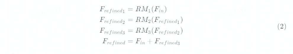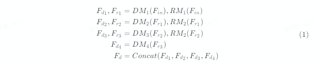 假设输入特征表示为 F_in,DM_j 和 RM_j 分别表示第 j 个蒸馏和细化模块,该过程可以描述为: