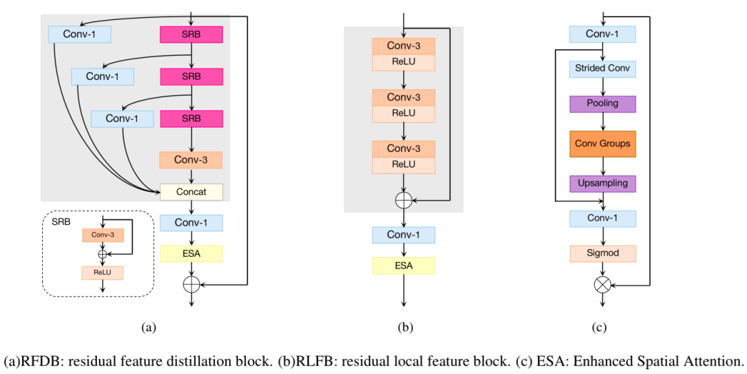 Residual Local Feature Network 的整体框架采用图片超分领域的基础结构,主要改进点在于核心模块 RLFB 的设计,下图 2(b)给出了 RLFB 的详细结构,它由 RFDN 中的 RFDB 模块演化而来。