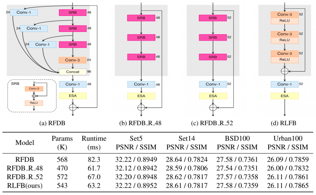 然后通过增大通道数的方式来提升模型表现,RFDB_R_52 的 PSNR 大幅超过 RFDB_R_48 但运行时间只是小幅增长。在 RFDB_R_52 的基础上,RLFB 中删除了 SRB 的密集加法操作并替换为普通的 CONV+RELU,进一步减少了运行时间。