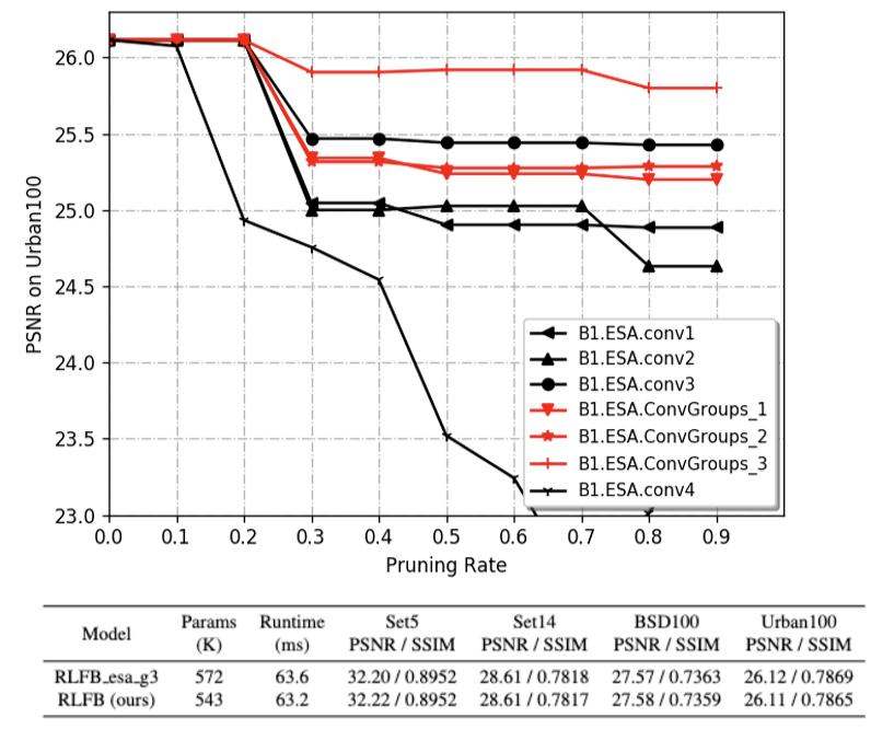 由于 ConvGroups 中的三个卷积层在冗余度排序中均处于靠前的位置 ,因此我们可以在没有明显效果损失的情况下将 ESA 中 ConvGroups 减少到一个 Conv 层。