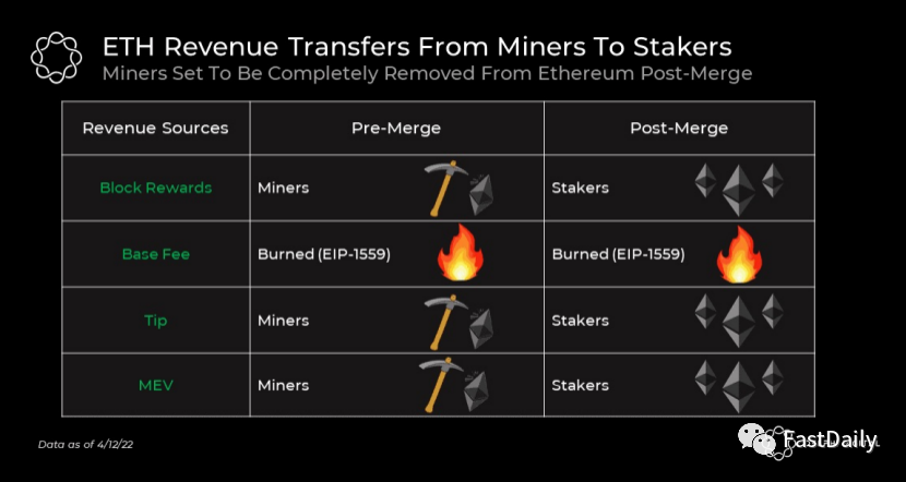 从PoW到PoS的变化将极大地改变以太坊的经济状况,矿工将完全脱离以太坊网络产生的收入,这些价值将主要以几种不同的方式返还给ETH存储者/验证者。区块奖励:区块奖励将在合并后被大幅削减,取决于ETH的数量,在60-90%之间,所有ETH持有者都将受益。剩余的区块奖励将支付给ETH验证者,并以订金率的形式实现。交易费用和MEV:自从实施EIP-1559以来,交易的基本费用部分已经被烧毁。通过Tips和MEV产生的额外收入现在被支付给ETH盯盘者/验证者,并以质押率的形式实现。虽然矿工被迫出售通过区块奖励、小费和MEV收集的大部分ETH以支付成本,但保管者/验证者产生的成本明显减少,导致被迫出售的情况减少。此外,由于ETH验证者/保管者已经拥有大量的ETH,可以认为他们看好以太坊,并且相对于矿工来说更有可能持有这些ETH奖励。抵押的ETH继续增长