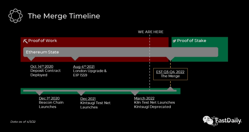 在部署存款合约之后,以太坊在2020年12月1日推出了其信标链:Beacon Chain并没有改变今天使用的Ethereum链的任何东西,而是将PoS引入Ethereum生态系统。信标链的目标是协调网络,作为合并后的以太坊共识层。后来在2021年8月5日,以太坊进行了伦敦升级,其中包括EIP-1559,这引入了一种机制,在每笔交易中燃烧ETH。然而,这种燃烧机制的引入是将ETH变成通缩资产的第一步,The Merge将采取进一步的措施来确保这种情况。The Merge的实际日期仍然未知,但根据进展速度和一些专家意见,我们预计The Merge将在今年(2022年)第三季度末或第四季度初左右发生。在4月29日的以太坊所有核心开发者电话会议上,将对执行合并或推迟合并做出 "去 "或 "不去 "的决定。如果它被批准继续进行,真正的合并将被计划在上述期间进行。从矿工到验证者的过渡