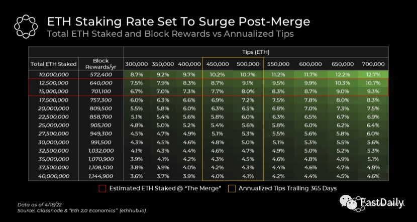 转载请微信联系:huangdiezi,更多DAO、Web3、NFT、Metaverse资讯请关注老雅痞合并的实际日期仍然未知,但根据进展速度和一些专家意见,我们预计合并将在今年第三季度末或第四季度初发生。目前,~9.7%的ETH总供应量被持续关注,所有被抵押的ETH将保持不流通,直到合并完成后最终发生另一次升级。因此,在可预见的未来,质押将继续成为ETH的一个重要供应渠道。EIP-1559是将ETH变成通缩资产的第一步,自2021年8月推出以来,它已导致~1.8%的ETH总供应被烧毁。合并将进一步削减ETH的发行量,其幅度在60-90%之间。根据合并后的ETH质押量、网络费用和MEV,ETH质押收益率可能在8.7-10.3%之间。目前,验证人的激活队列刚刚超过2周,预计将随着更多的ETH被质押而增加。如果Lido能够在排队期间补贴收益率并继续吸纳用户,那么验证者队列可能会给Lido这样的流动性抵押衍生项目带来机会。合并:PoW -> PoS