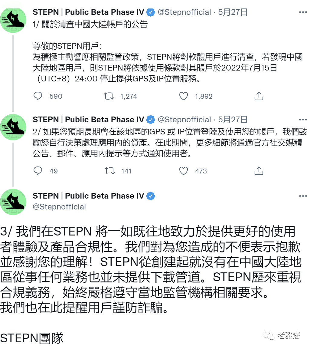2022年5月27日,Move to Earn应用STEPN在其官方推特上发布《关于清查中国大陆帐户的公告》。据该公告内容显示,为积极主动响应相关监管政策,STEPN将清查中国大陆帐户,若发现中国大陆地区用户,STEPN将依据使用条款对其账户于2022年7月15日(UTC+8)24:00停止提供GPS及IP位置服务。如果用户预期长期会在该地区的GPS或IP位置登陆及使用帐户,官方鼓励用户自行决策处理应用内的资产。在此期间,更多细节将通过官方社交媒体公告、邮件、应用内提示等方式通知使用者。