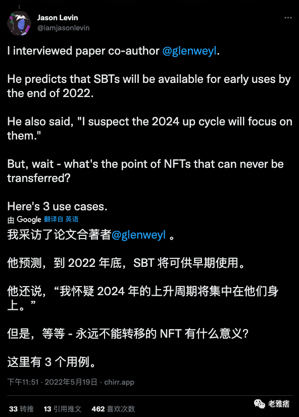 据Jason Levin说,SBTs可能在2022年底之前可用,他采访了该论文的合著者E. Glen Weyl。