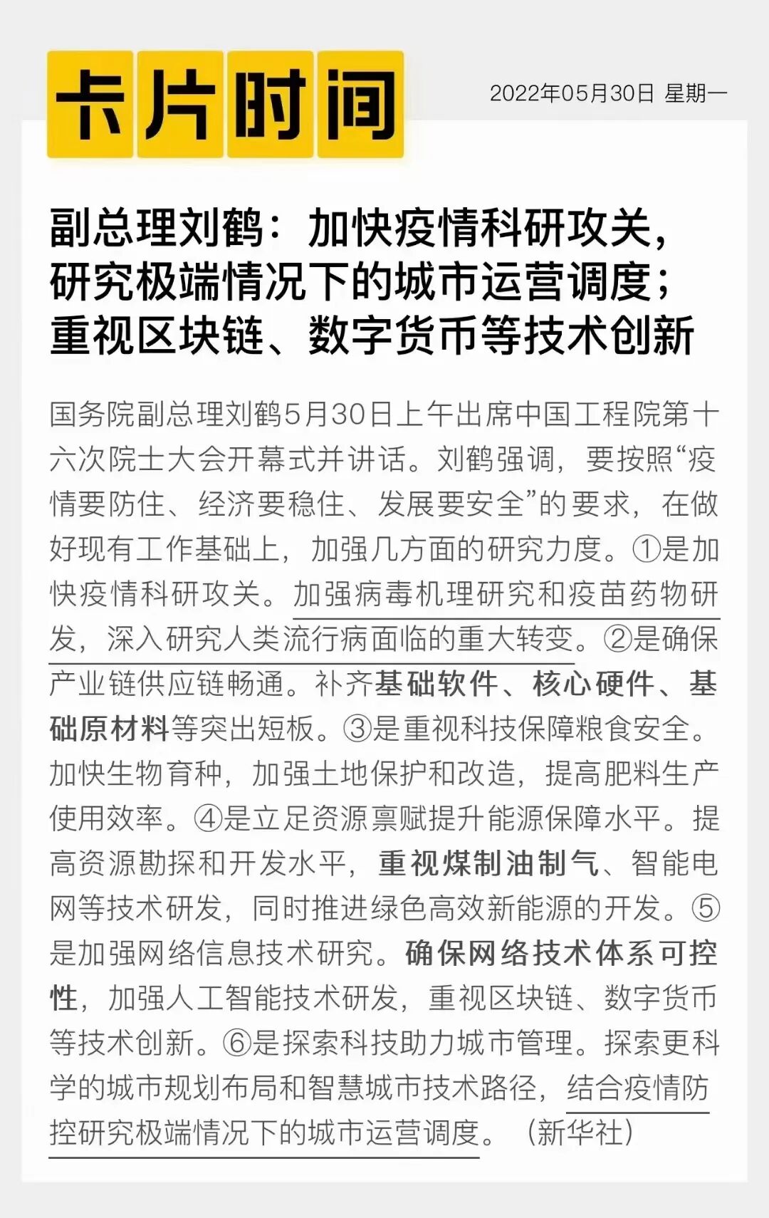 5月31日消息,中共中央政治局委员、国务院副总理刘鹤 5 月 30 日上午出席中国工程院第十六次院士大会开幕式并讲话。刘鹤强调,要按照“疫情要防住、经济要稳住、发展要安全”的要求,在做好现有工作基础上,加强几方面的研究力度。其中提到加强网络信息技术研究。确保网络技术体系可控性,加强人工智能技术研发,重视区块链、数字货币等技术创新。