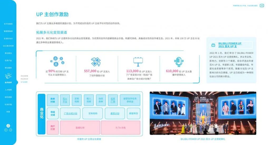 2021年,B站持续为UP主提供多元化的商业变现渠道,构建可持续、具备成长性的创作者生态。数据显示,共有130万UP主在B站通过多种商业渠道获得收入,商业化渠道主要集中在商单对接、收益分成、用户打赏三个方面。