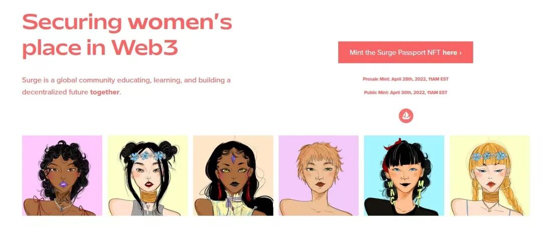 近期,SurgeWomen团队的Surge Passport系列 NFT开放mint了,SurgeWomen的成立是为了解决web3中巨大的性别不平衡问题,通过教育和授权,让妇女能参与到社会的各个层面。https://www.surgewomen.io/