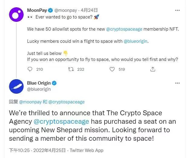 加密航天局(CSA)有雄心勃勃的计划,将太空探索和Web3技术结合在一起,以加速人类的异世界未来。该项目于4月25日星期一发布了Gen-1 NFT会员资格drop,代币持有者获得了难得的机会,可以在即将到来的太空任务中成为“Cryptonaunts”。作为CSA的太空发射提供商,Blue Origin在周一发送的一条推文中确认了即将到来的新谢泼德任务的席位。航天机构只为各自的国家利益服务。CSA打算通过将重点转向有利于全球社区的平等主义太空项目来改变现状。先不说航空飞船的机票,期待旅行机票变成可收藏的NFT~~情报来源:https://twitter.com/blueorigin/status/1518597006242971648