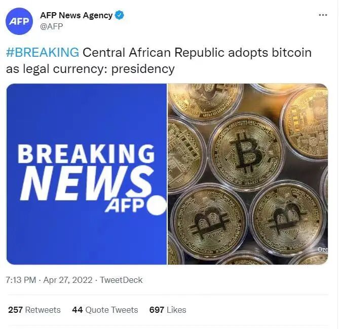 继萨尔瓦多后,中非共和国总统办公室宣布将比特币作为法定货币。中非共和国作为人均GDP不足500美元的世界最不发达国家之一,这次坐着中本聪号火箭直接从web0.0直飞元宇宙......这让我有个疑问,当地的网络覆盖程度能支持大饼支付不?LOL,相信未来几年,会有越来越多的国家,投奔中本聪大神,积少成多,蔓延开来~情报来源:https://twitter.com/AFP/status/1519273589299630080?s=20&t=jBGx-rYyR3xw2W-EV0AGxA
