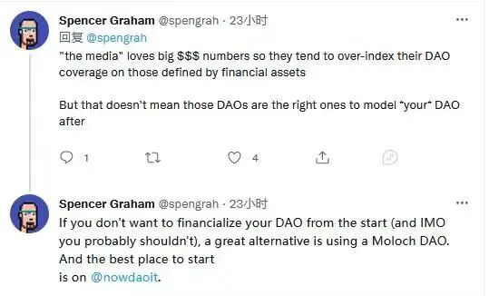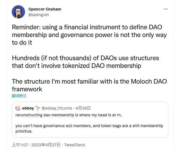 最近,DAOHaus 的 Spencer Graham和Radicle联合创始人Abbey Titcomb在推特上互动:**Abbey Titcomb:**最近我在重构DAO的成员资格,你不能没有成员来参与治理,但根据代币持有量来衡量成员的会员权利是很糟糕的事情。**Spencer Graham:**用金融工具来定义成员资格和治理权利不是唯一的方式,成千(甚至上万)个DAO并不涉及代币化的成员资格。我最熟悉的这类结构就是Moloch DAO构架。媒体喜欢大$$$数字,因此他们倾向于将其 报道范围过度局限在金融资产定义的DAO。但这并不意味着你们的DAO模仿这些DAO是正确的事情。如果你不想(我认为你不应该)从一开始就将你的 DAO 金融化,一个很好的选择是使用 Moloch DAO构架。一最好就从DAOhaus开始。情报员评论:Moloch DAO的Baal能否去一去DAO的铜臭味,同时又能治理好DAO,让我们拭目以待!https://twitter.com/spengrah/status/1519000319186898946?s=21&t=7tJ5Nlj7iLgZJl5shQQCYQ