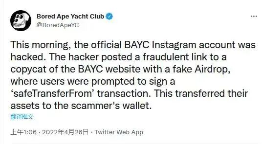 4月25日上午,BAYC 官方 Instagram 账号被黑。黑客通过虚假空投发布了一个指向仿冒 BAYC 网站的欺诈链接,并提示用户签署“safeTransferFrom”交易,用户签名后就将他们的资产转移到了诈骗者的钱包中。黑客盗取了765.3枚ETH及包含BAYC、MAYC、BAKC、CloneX在内的91枚NFT,根据当时市场的底价,被转移的NFT价值超过 1000 万美元。咱们上一期才提醒的官方链接亦有风险,这来得也太快了点。。。。。https://twitter.com/boredapeyc/status/1518637579633053701?s=21&t=2LWySfjBL7ki8r9j548LIw