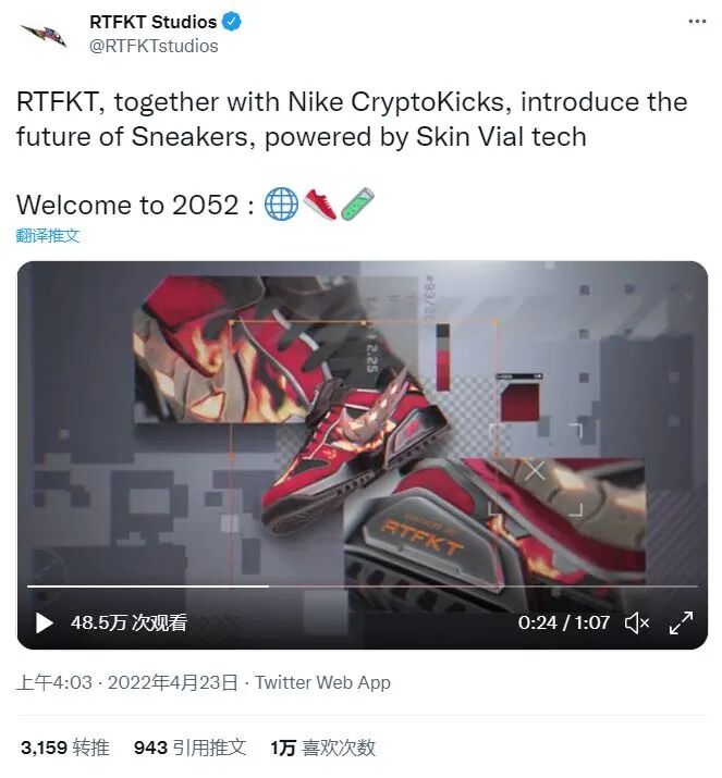 耐克Nike与2021年收购的NFT公司RTFKT工作室合作,在以太坊上发布了其首款CryptoKicks 。这些运动鞋现在的售价约为2.5 ETH(7500美元)至3我记得小时候在nike店里,听见有个爸爸说,嗯,给儿子买双鞋,一个电视机没了......现在他要看见这Cryptokicks, 估计得庆幸生孩子生得早......https://twitter.com/RTFKTstudios/status/1517595067736858625