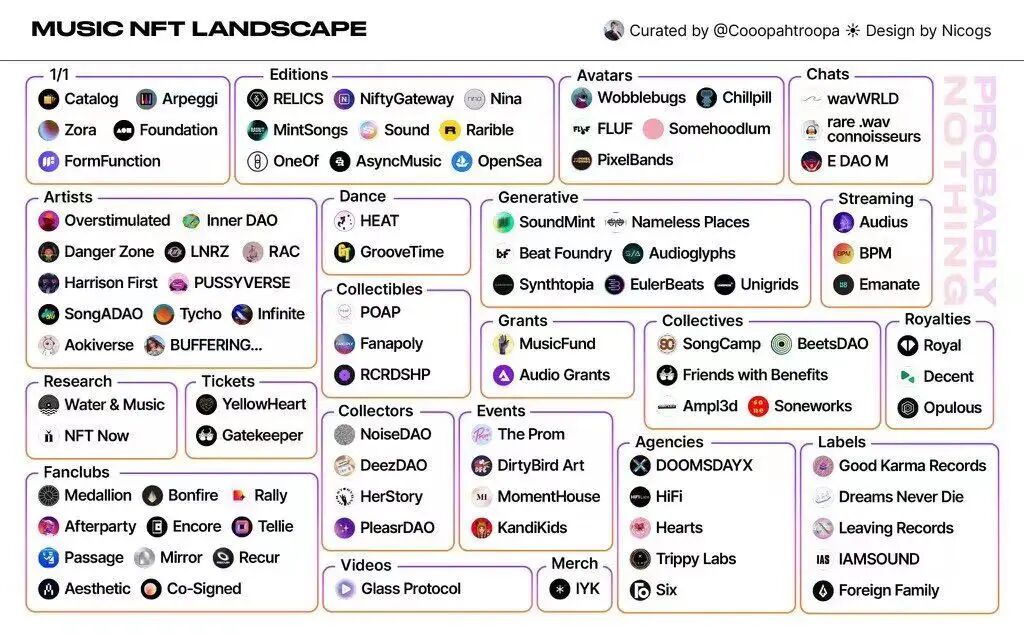 4 月 25 号,@Cooopahtroopa ****分享了他的音乐 NFT 版图研究梳理,如下图,超过 50 个音乐 NFT 项目上榜。情报来源:https://twitter.com/Cooopahtroopa/status/1518328255920680961