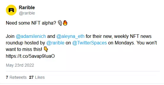 另外宣布一下:我将与来自 Rarible 的 Adam 开始每周一次的 Twitter Space会议,我们将讨论本周的新闻!今天在美国东部标准时间下午 2 点/太平洋标准时间下午 5 点收听。你可以通过我的 或Rarible's的推特儿找到入口!