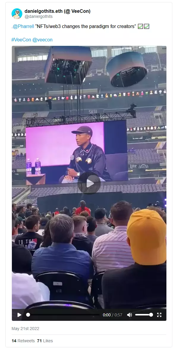 Veecon 有数千名参会者和数百名演讲者。一些小组成员和参会者包括 Snoop Dogg、Pharrell、Mila Kunis、Steve Aoki、Eva Longoria、Spike Lee、Beeple、pppleasr、FEWOCiOUS、Danny Cole,以及 World of Women、Art Blocks 和 Cool Cats 等的创始人。