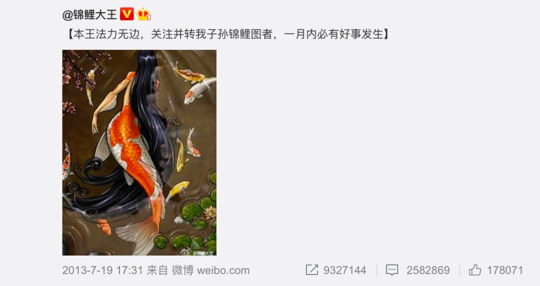 最近过得不太顺利?转发一条锦鲤就好了。最近很顺利?转发锦鲤也许可以更顺利。或者旋转星球、发光猫咪、可爱鸭子、罕见彩虹……转发起来都有同等效果:厄运退散,好运到来。一般转发者也会自嘲一句「日常迷信」,但是这种迷信只有零次和无数次的区别——一旦发过,隔个十天半月总需要再发一次。在所有属于「日常迷信」的祈祷中,锦鲤是历史最「悠久」、「可信度」最高、接受度最广泛的「灵符」。连一路交好运的人,也会被冠以「锦鲤」称号,比如前几年从「创造 101」出道的明星杨超越。锦鲤从哪里来,它的魅力为何经久不衰?很多人看不起这场「网络狂欢」,却很少关注大量、真实的附着在锦鲤上的情感需求。锦鲤(Koi)是鲤鱼的一种。从生物学的意义上看,它起源于中国。据悉在公元前 12 世纪,中国就开始养殖鲤鱼。但在文化意义上,锦鲤完全是属于日本的「舶来品」,并逐渐成为日本地方民俗文化乃至传统国家文化的象征。鲤鱼传到日本后,新泻县中越地区的山间有在水田里养殖鲤鱼的习惯。19 世纪初的江户时代,新泻县不仅有黑鲤,还培育出了红鲤和白鲤,两者的后代又产生了更复杂的花纹。观赏性的鲤鱼逐渐出现。1914 年东京大正博览会上,新泻县展出了「变种鲤鱼」,一举拿下博览会银牌,连当时的皇太子裕仁亲王(昭和天皇)也大感兴趣。从此新泻县名声大噪,民众受了鼓舞,持续改良繁殖技术,培育出「大正三色」品种,这些鲤鱼开始有了「锦鲤」的名字。「锦鲤」之名是二战后才普及和固定下来的。1952 年,新泻县的鲤鱼养殖机构正式定名「新泻县锦鲤养殖渔业组合」。到了 20 世纪六十七年代,锦鲤走出新泻县,走向全日本。「全日本锦鲤振兴会」这样的全国性机构出现了,还举办了第一届全日本综合锦鲤品评会,自此锦鲤又有「国鱼」之称。不能忽略的是,政治家田中角荣的家乡就是新泻,他参加选举的文化策略,也推高了锦鲤的知名度。1970 年的大阪世博会,会场里出现了日本特色的庭院,来自新泻、大阪、广岛的锦鲤在其中悠游嬉戏,成为「和风之美」的重要组成部分。很快,锦鲤也向大熊猫一样走向了全球。一方面,日本各级政府将锦鲤当作外交赠品,一方面,海外的日本移民也开始成立爱好者团体,在民间扩大锦鲤的影响力。随着关注者的增多,锦鲤的产业化发展了起来。锦鲤繁殖技术,既靠系统交配,也靠个人筛选,科学和经验缺一不可。甚至锦鲤繁育技术培训也成了热门课程,很多外国人远渡重洋来上课学艺。品种多了,鉴赏也提上了日程。锦鲤的欣赏、品鉴和评价都有自己的体系。据悉有 100 种以上的锦鲤名称都有日本术语,评判的体型、色彩、图案等标准也往往由日本决定。象征符号、养殖和鉴赏一起构成了日本的锦鲤文化。去年召开的东京奥运会,马术预选赛就设置了达摩、锦鲤、和服、太鼓等颇具和风的障碍物,这些人们耳熟能详的「日式」形象,已经国际范十足了。鲤鱼在中国本身就有「祥瑞」的内涵。孔子的儿子孔鲤,字伯鱼,也激励了不少知识分子对鲤鱼象征的品德加以肯定。「鲤鱼跳龙门」是民间最熟悉的图样,年画、刺绣、木雕、印染和剪纸上都十分常见,其背后暗示了「飞黄腾达」的美好愿望。白白胖胖的小孩怀里抱着肥美的大红鲤鱼,也许是中国历史上销量最高的年画之一。除了象征发达,大红鲤鱼还意味着富庶和丰饶。在农业社会,能把小孩子和鲤鱼都养得胖胖的,一定是丰年无疑了。传统的园林里,庭院水系也少不了黑鲤鱼和红鲤鱼的身影。不过,在 20 世纪九十年代之后,一些公园和园林里,鲤鱼逐渐被锦鲤替代。日本锦鲤的兴盛,最先影响了经济较为发达的珠三角和长三角地区。一些地方政府希望借此提振经济,也有意识推动锦鲤产业的发展。像广东的顺德、中山、江门,都有锦鲤繁育基地,江门还被中国渔业协会评为「中国锦鲤之乡」。对于中国人来说,接受日本锦鲤并不难,毕竟鲤鱼和鲤鱼代表的「吉祥」意义「自古有之」,二者文化上的亲缘性难以否认。虽然日本并不将锦鲤视为中国文化的一部分(和茶道有些类似),但中国人有意识地认为锦鲤起源于「中国文化」,有时也会对其进行一些「本土化」的建构,比如品鉴时采取某种「中国文化」标准。前几年,锦鲤的投资属性相当惊人。一条锦鲤上百万的新闻不时传出。企业家、投资家等经常为其一掷千金,锦鲤和名人字画、古董古玩等艺术品一起登上大雅之堂。作为投资品的锦鲤,其品鉴是完全依照日本制定的标准的。锦鲤在中国成为互联网迷因(memes),最早出现在 2013 年的微博。2013 年 7 月,一位名为「锦鲤大王」的大 V 账号发出第一条微博,说「关注并转锦鲤图者一个月内必有好事发生」。该条微博不到一年被转载了 90 多万次。在那之后,转发锦鲤求好运的祈祷再没有停止过。虽然网友们配图不太一样,有人配日本锦鲤,有人配中国鲤鱼,还有人发杨超越——「人形锦鲤」,到后面锦鲤完全抽象化了:是中国还是日本锦鲤不重要,图中有没有锦鲤都一样,猫咪、小狗、鸭子、大鹅都可以,反正图的就是一个「好运连连」。日常迷信是生活的一部分。有锦鲤,就用锦鲤。没有锦鲤,也要创造锦鲤——十几年前网友们还拜过从综艺选秀节目「超级女声」出道的李宇春,「信春哥,不挂科」。有研究者对参与微博「锦鲤」话题的用户进行调查,其中 87% 以上的用