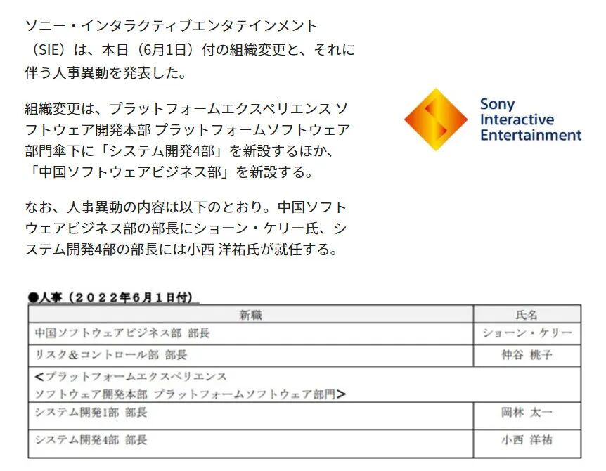 SIE今天发布了新的人事变动通知,其中提到SIE新设立了一个名为“中国软件商务部”的新部门,部长由肖恩·凯利担任,不过还尚未提及该部门的具体业务。