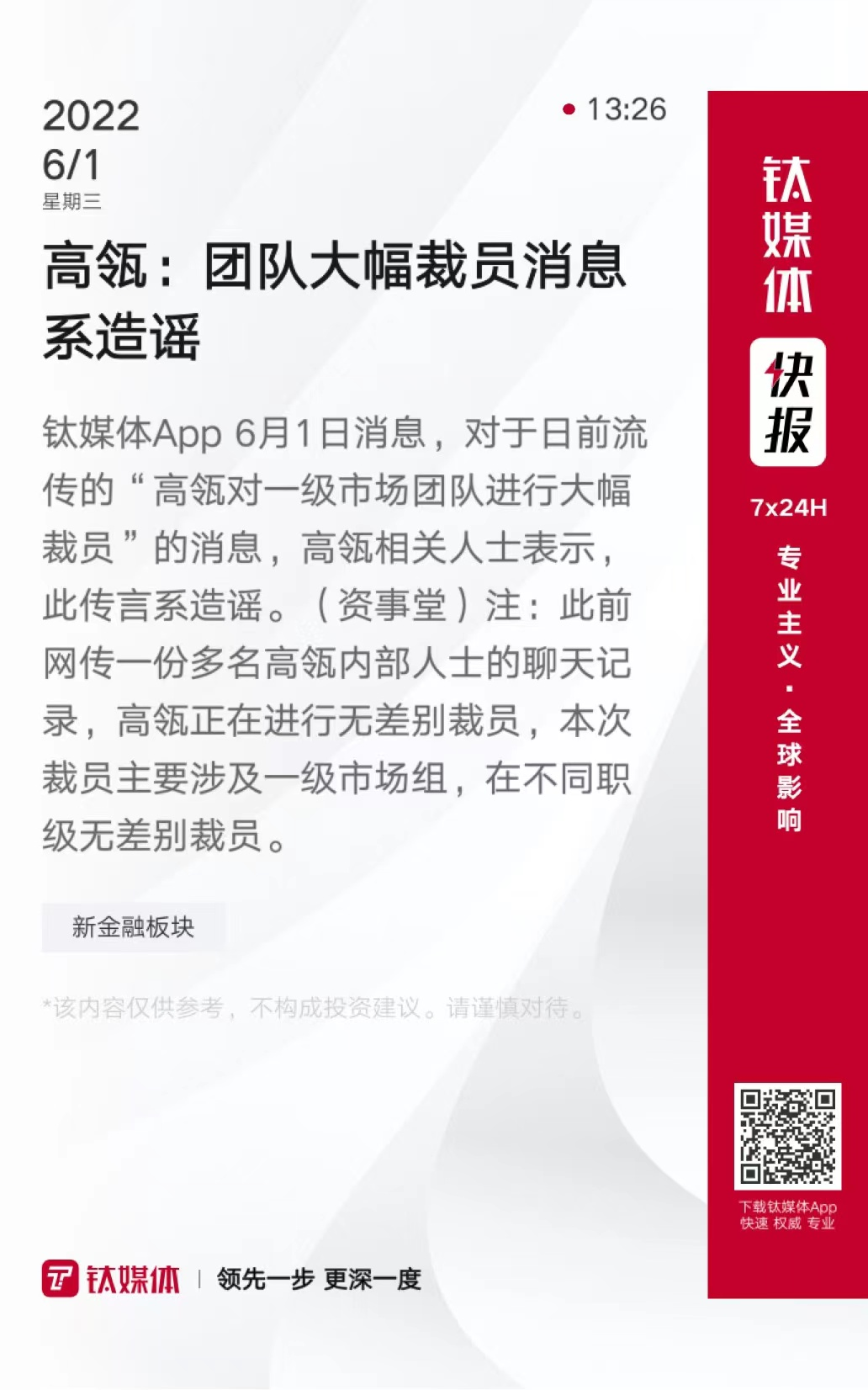 高瓴:团队大幅裁员消息系造谣