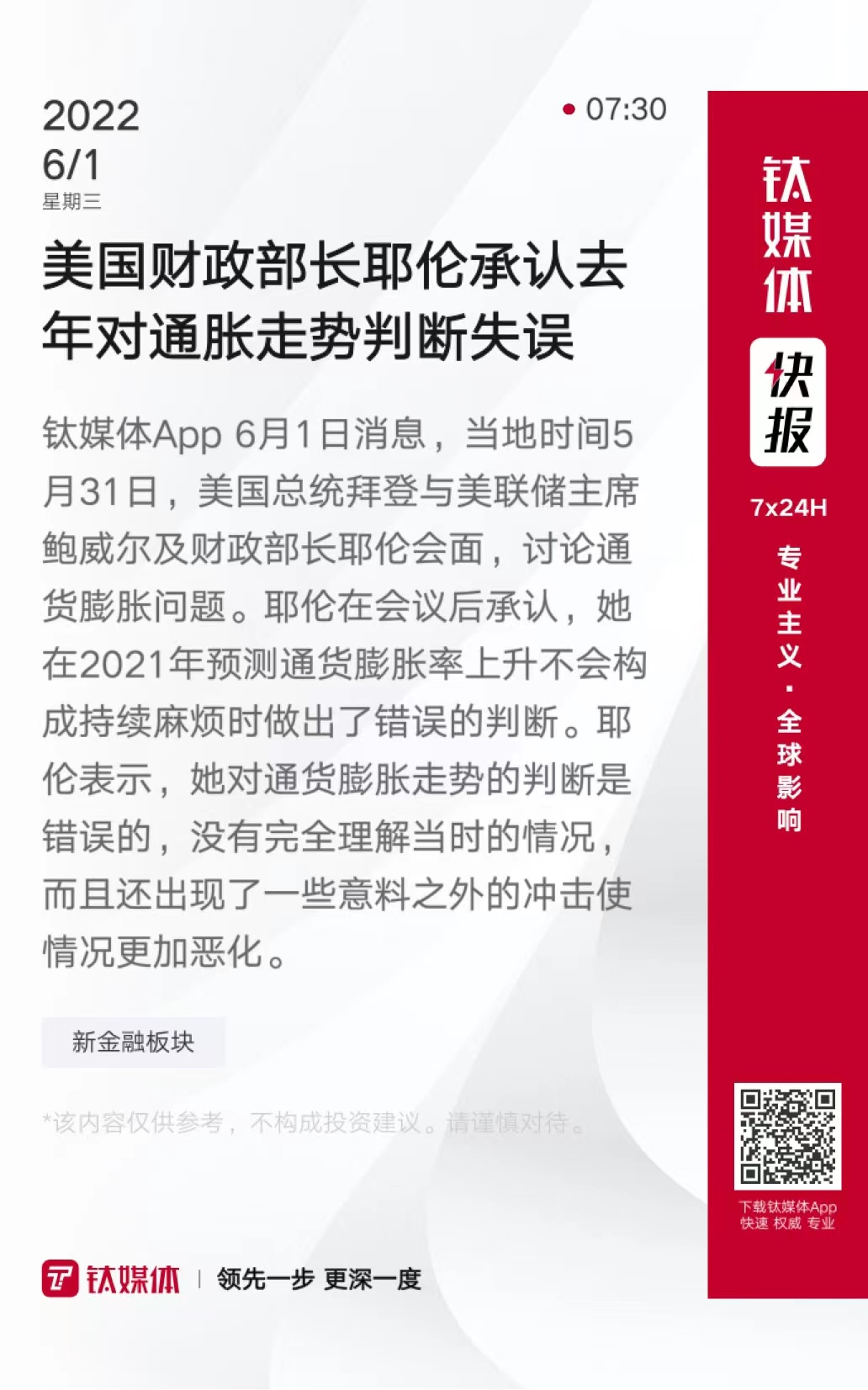 美国财政部长耶伦承认去年对通胀走势判断失误