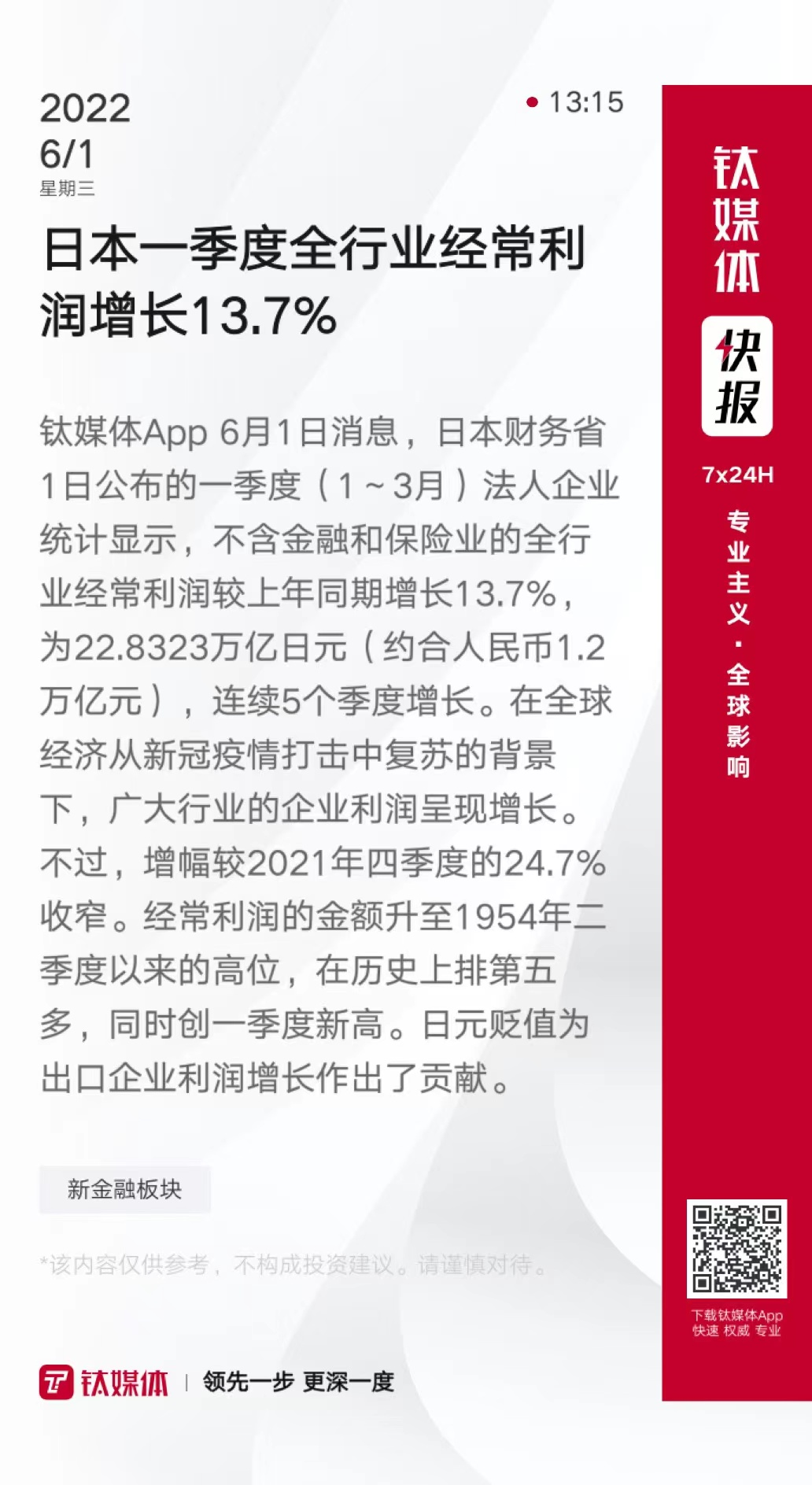 日本一季度全行业经常利润增长13.7%