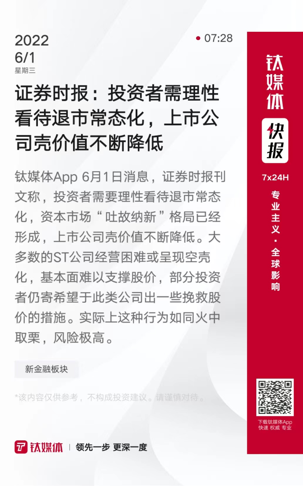 证券时报:投资者需理性看待退市常态化,上市公司壳价值不断降低