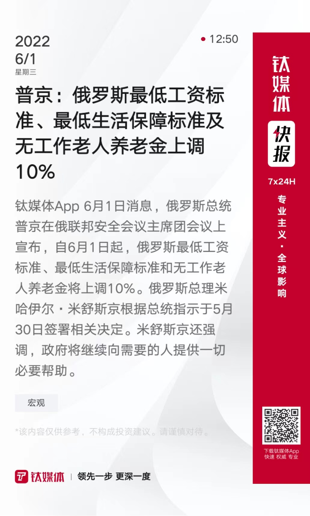 普京:俄罗斯最低工资标准、最低生活保障标准及无工作老人养老金上调10%
