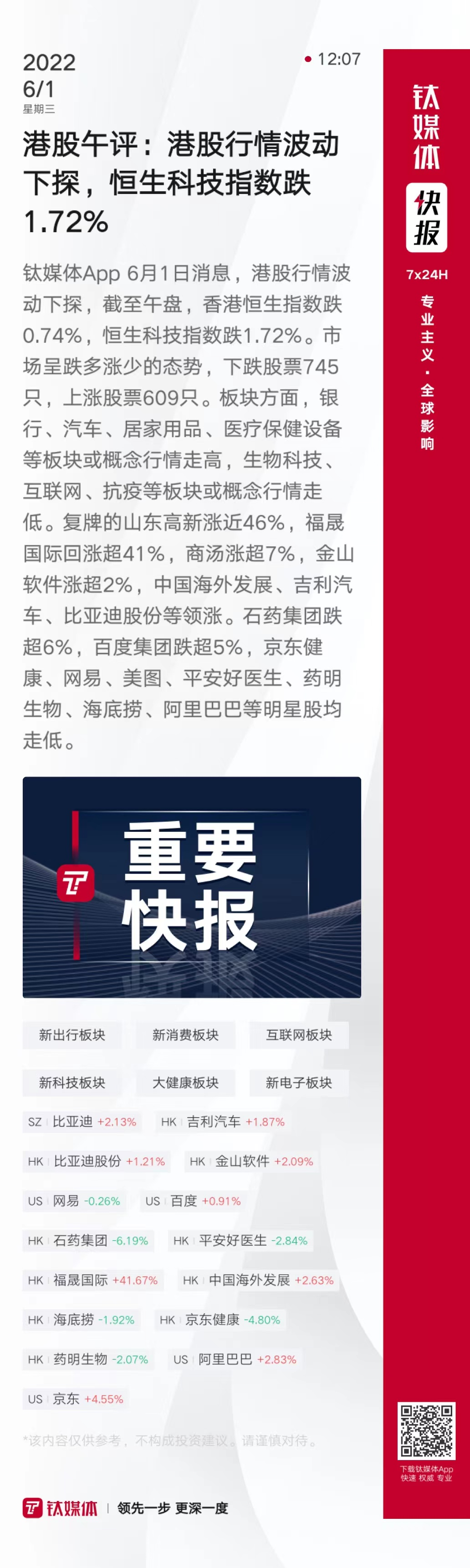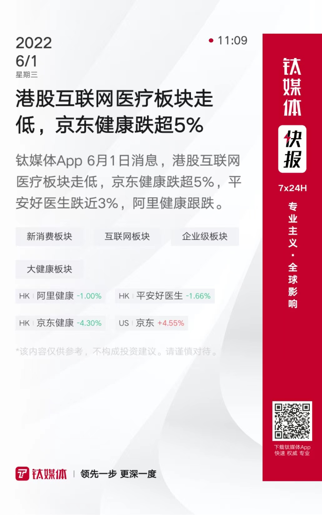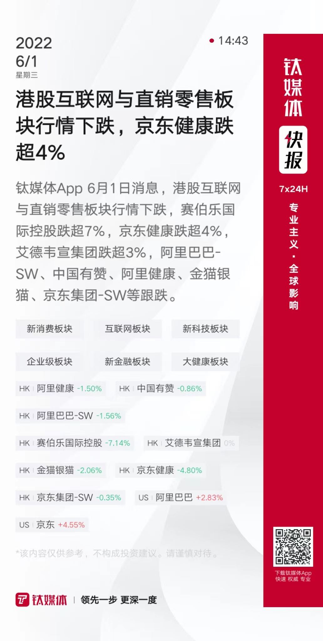 港股互联网与直销零售板块行情下跌,京东健康跌超4%