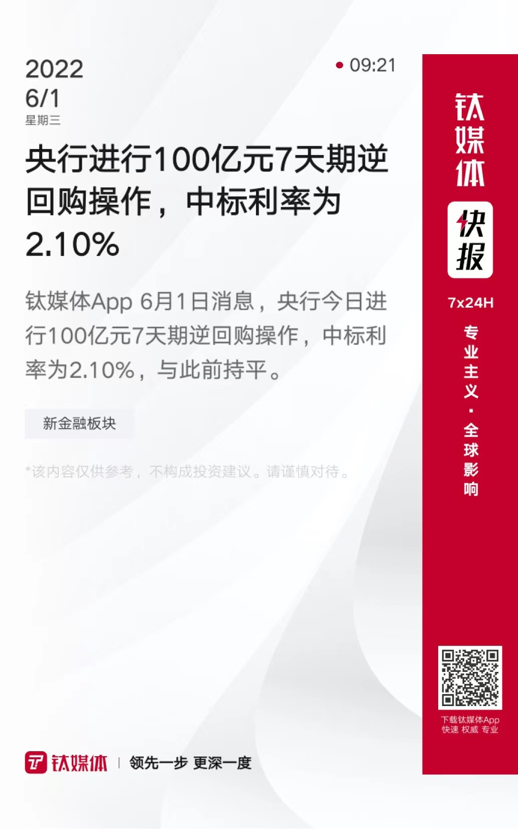 央行进行100亿元7天期逆回购操作,中标利率为2.10%