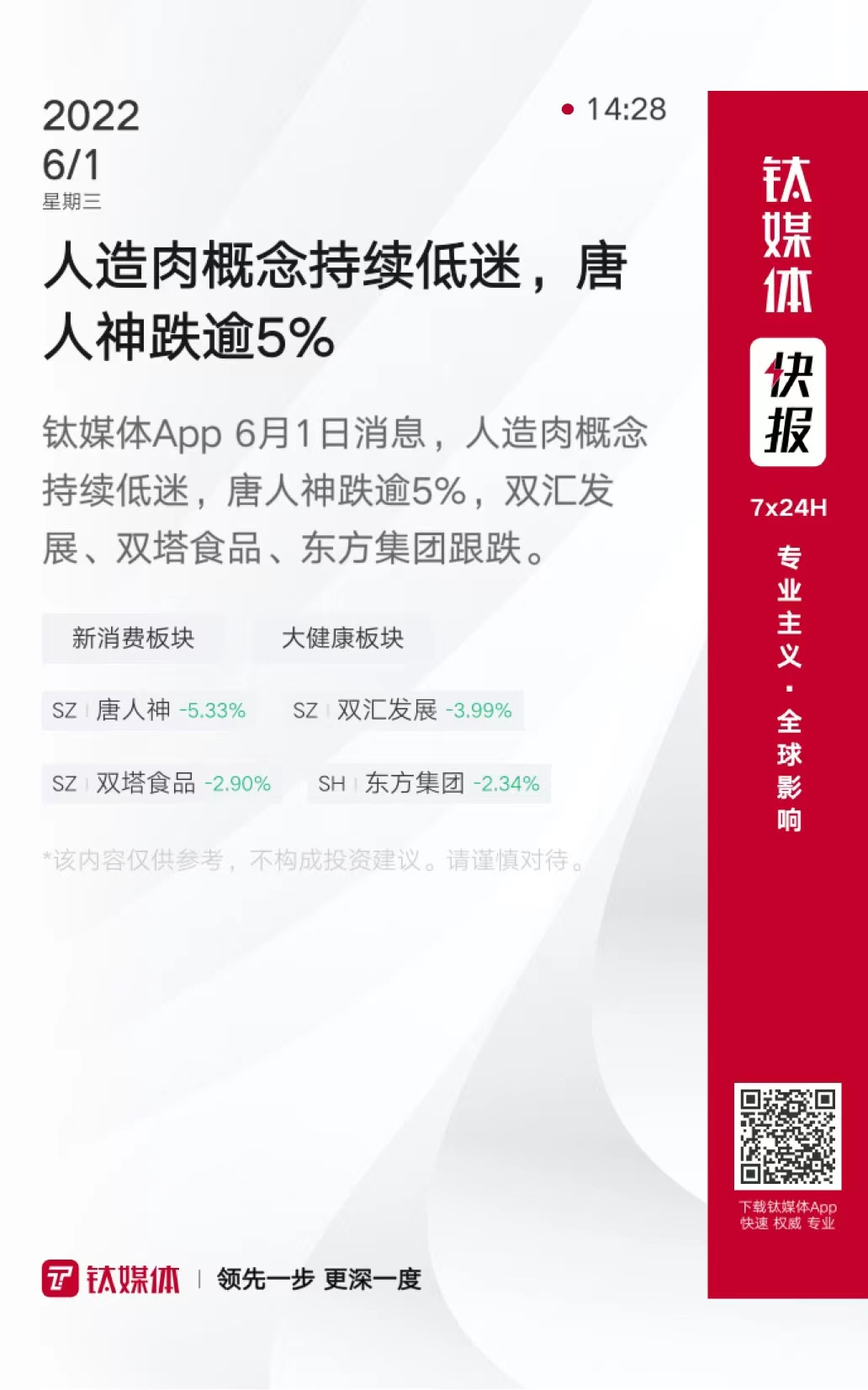 人造肉概念持续低迷,唐人神跌逾5%
