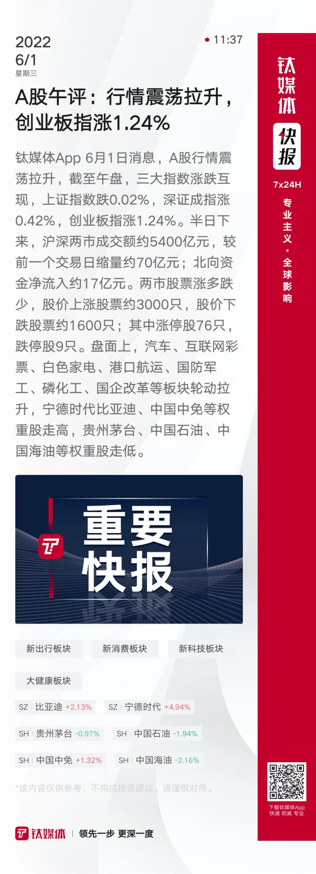 A股午评:行情震荡拉升,创业板指涨1.24%