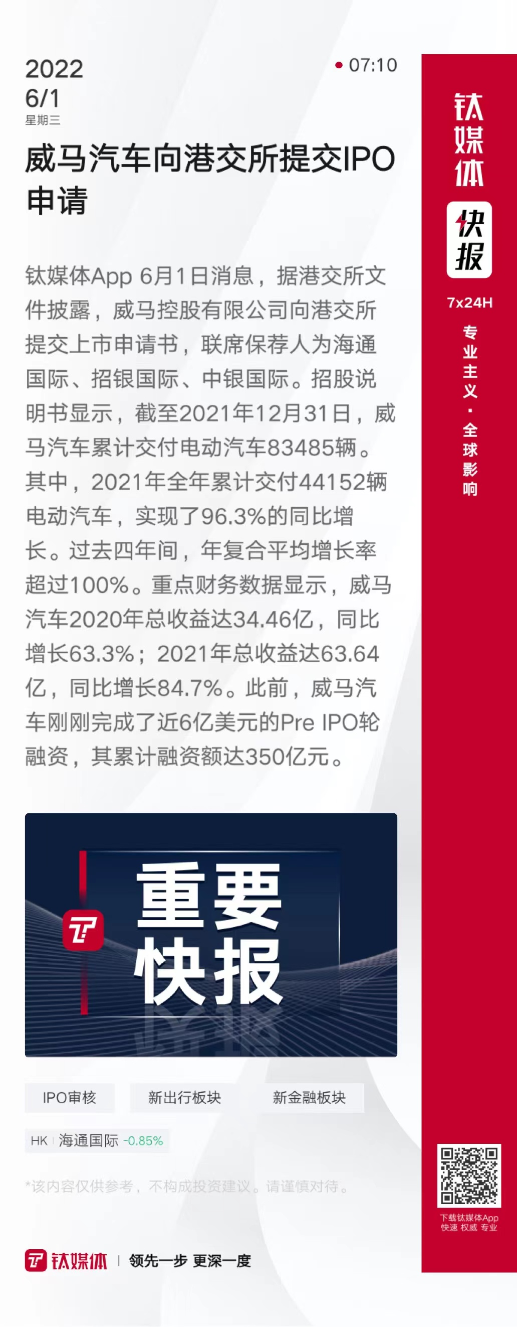 威马汽车向港交所提交IPO申请