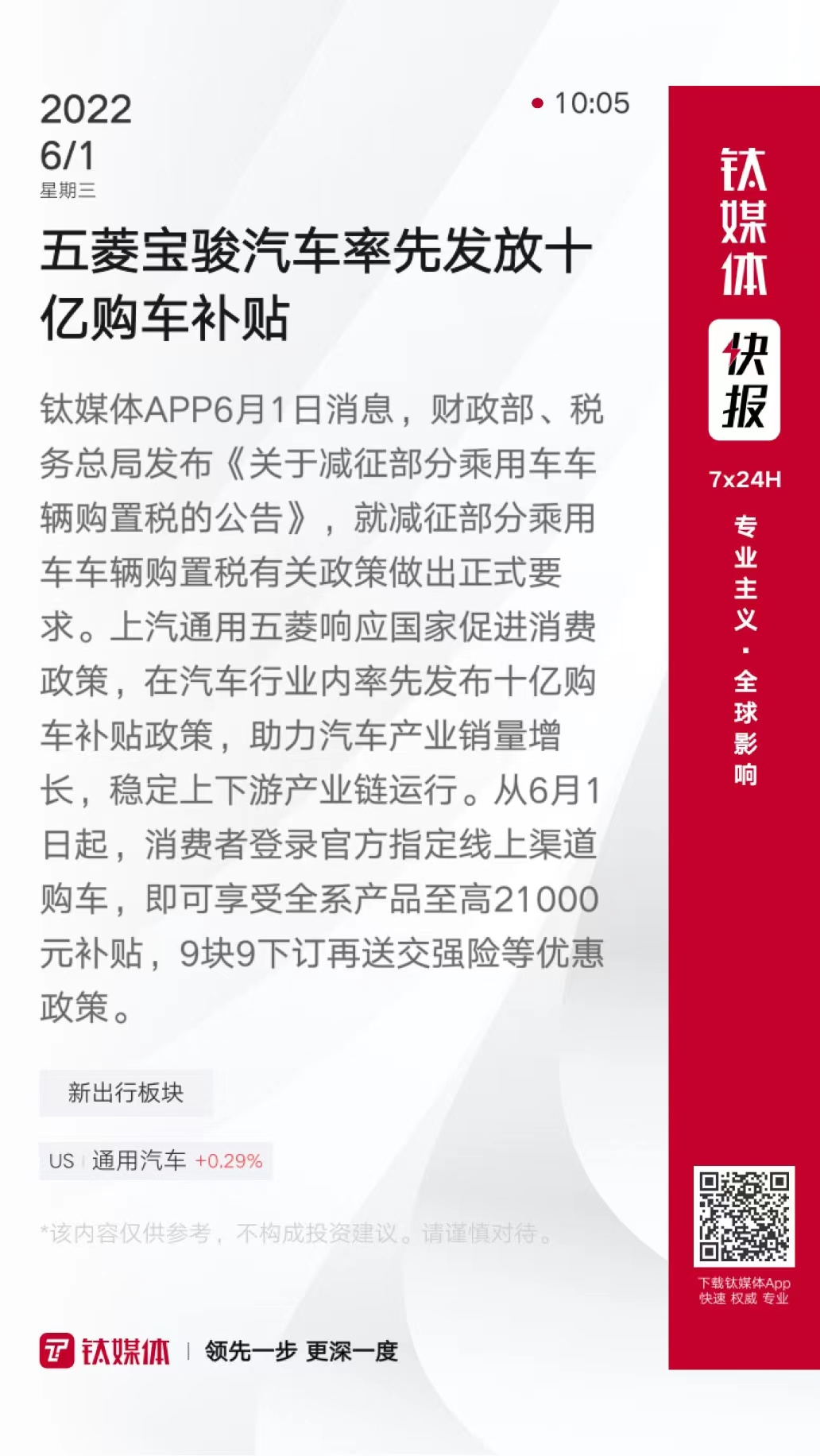五菱宝骏汽车率先发放十亿购车补贴