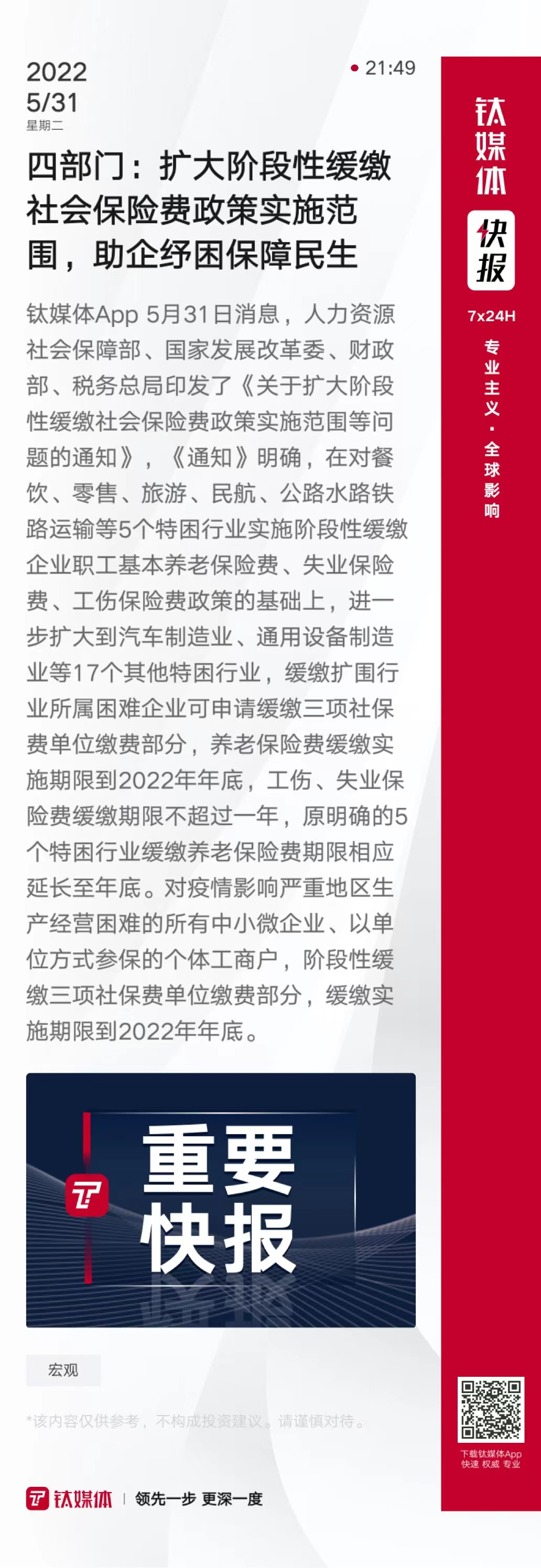 四部门:扩大阶段性缓缴社会保险费政策实施范围,助企纾困保障民生