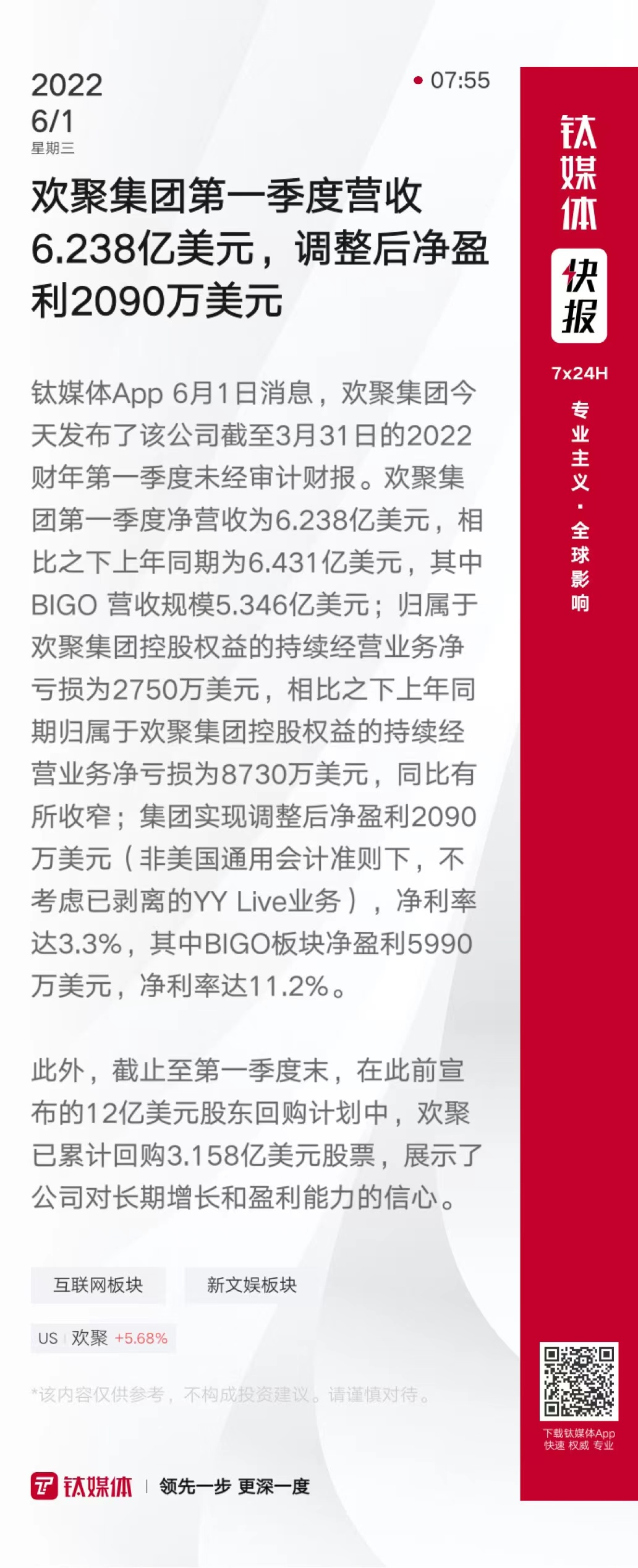 欢聚集团第一季度营收6.238亿美元,调整后净盈利2090万美元
