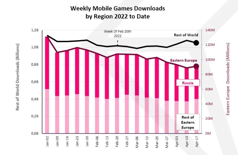 另外,如上图所示,东欧地区的区域下载量也发生了一定程度的下降。2月初,东欧居民的移动游戏周下载量约为1.1亿次,俄罗斯约占6000万次,而目前,该地区移动游戏的周下载量已下降至为9000万次——在战争带的影响冲击下,俄罗斯让仍能贡献出超半数的下载量。