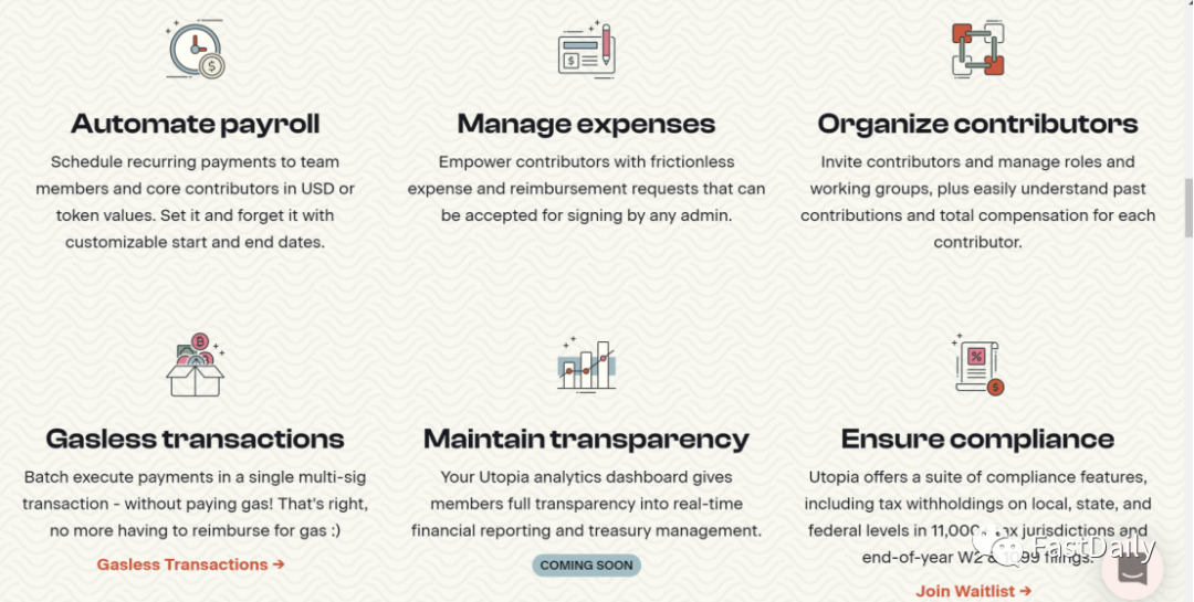 Utopia可以帮助DAO完成贡献者的组织并进行管理和工作组设置,还可以轻松了解每个贡献者过去的贡献和总薪酬待遇。
