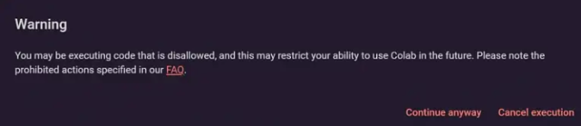 “您正在执行被禁止的代码,这将有可能影响您在未来使用 Colab 的能力。请查阅FAQ页面下专门列出的禁止行为。”