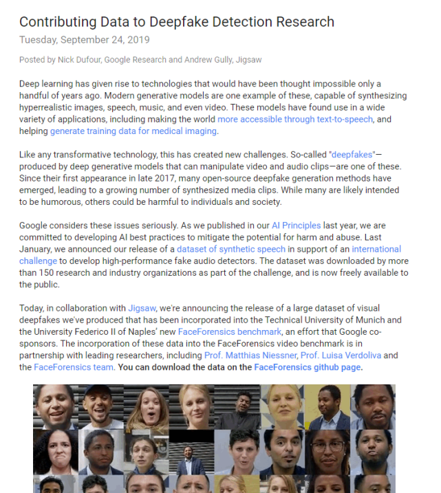 这的确不是谷歌第一次出面打击 deepfake 内容制作了。在2019年,Google Research就发表过一个大型视频数据集。其背后是谷歌在自己内部通过制作 deepfake 视频的方式,从而试图了解相关算法的工作原理。