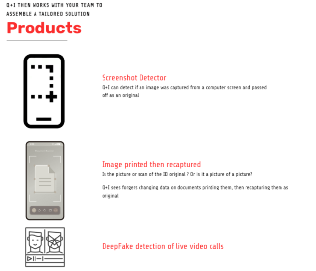 Quantum+Integrity:瑞士公司,提供一套基于 API 的 SaaS 服务,可以进行各种基于图像类的检测,能力包括视频会议实时 deepfake、截屏或图片“套娃”、虚假身份证件等。